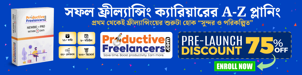 ১১ ঘণ্টারও বেশি, ৬+ মডিউল, এবং ৫৫+ লেসনস নিয়ে "ProductiveFreelancers" কোর্সটিকে প্রস্তুত করা হয়েছে যাতে কোনো বাধা এবং ভয়-ভীতি ছাড়া আপনি সঠিক গাইডলাইনে এবং সহজভাবে ফ্রীল্যান্সিং শুরু করতে পারেন